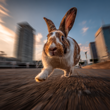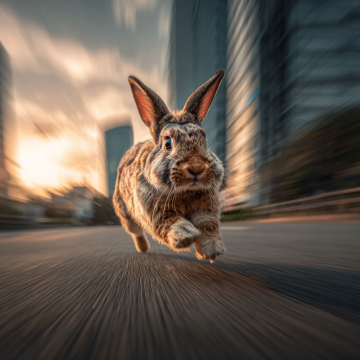 提示词: Low-angle dynamic shot of the rabbit sprinting at full speed in the final stretch. Motion blur on the background buildings and road, his muscles taut, face determined, a burst of energy and speed. Urban environment, dramatic sunset light, sense of immense velocity.