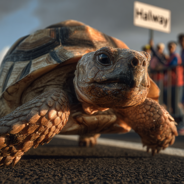 提示词: Close-up shot of the turtle running, determined expression, steady breath, sweat on forehead. A milestone marker shows “Halfway” in the background. Supportive spectators out of focus. Golden hour lighting, emphasizing perseverance, detailed texture.
