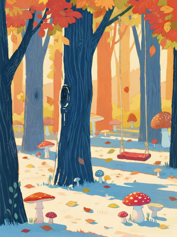 【秋季】远景镜头,琥珀色的水彩幻化成轻盈的纱幔铺展背景,金黄、橙红与赭石色的枫叶、银杏叶交织飘落,其间点缀着米白的雏菊与深紫的秋菊,晨雾凝结的露珠泛着冷光,夕阳透过疏朗枝叶洒下暖橙光斑,色调以琥珀金为主,融合橙红与赭石,呈现秋日成熟的诗意童话。