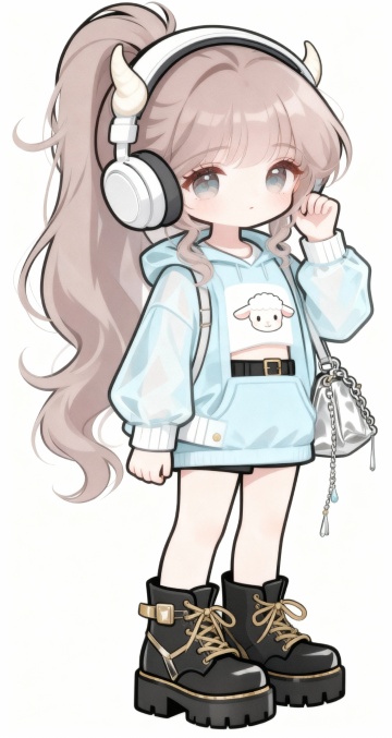 二次元动漫风格立绘,白色背景,正面全身视角,一位有着粉色双马尾的少女,黄色眼眸,表情俏皮可爱,穿着橙色连帽卫衣,内搭白色T恤,下身搭配牛仔背带短裤,脚穿红色运动鞋,卫衣袖子上有黑色音符图案,整体造型青春活力,色彩明快,线条流畅,细节精致,光影柔和,具有动漫插画的质感和美感。