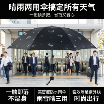 这张图片是产品主体这款产品是手动雨伞 我需要设计20张主图在拼多多上面售卖 可以用 早八赶地铁、下班遇暴雨 孩子上学怕淋雨、放学 怕晒黑 爬山、野餐、海边游玩?晴雨两用伞搞定所有天气等场景 进行主图场景布局设计一个高级主图 一些主图文案内容 一触即落 不湿身 高密度防水雨伞 雨雪晴三用 精致雨骨 有效防雨 高密伞布 有效抗风 超强拒水 一甩即干 超强结构 风雨雪无忧 折叠携带 精工细作 大伞面 强效隔绝紫外线 时尚出行 轻便出行 坚固抗风 晴雨双用!一把顶多把,省钱又省心 抗风防水 + 防晒!闭眼入不踩雷 加大双人伞!暴雨大太阳都不怕