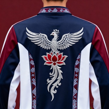 设计一款班服,圆领长袖,包含畲族元素、“莲”元素,两者布局协调、风格统一需突出班级特色,位置合理,不遮挡核心文化元素主色调以畲族传统配色为主,适配日常穿着与正式活动场景 图案布局疏密得当,核心元素突出,无过度拥挤或留白过多问题,视觉效果整洁美观。