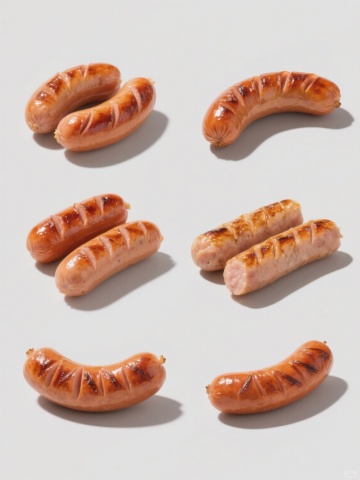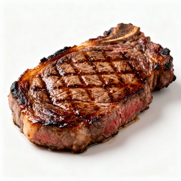 一块精心烤制的厚切牛排,表面呈现出诱人的深棕褐色烤痕,纹理清晰,边缘微焦,内部肉质呈现鲜嫩的粉红色,散发着多汁的光泽,白色背景,牛排被切成几片堆叠在一起,立体感强,光影效果突出,肉质纹理细腻,质感真实,散发着浓郁的烤肉香气。