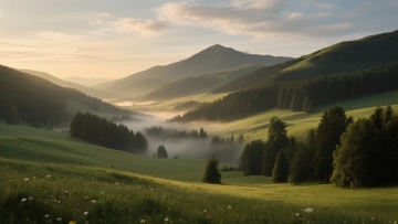 一片宁静的湖泊,湖面如镜倒映着蓝天白云,湖边生长着郁郁葱葱的绿树和五彩斑斓的野花,远处是连绵起伏的青山,山间云雾缭绕,阳光透过云层洒下柔和的光芒,整个画面充满生机与诗意,色彩清新明亮,构图和谐自然