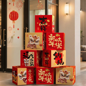 国潮风坚果礼盒,拟人化笑脸由坚果拼成,浮雕云纹点缀,喜庆红金配色,中式元素与现代创意融合,节日氛围浓厚。