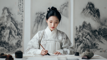 写实风格摄影,画面整体采用柔和的靛蓝色与暖橙色对比色调,一位约四十岁左右的中年男子,身着象牙白传统中式长衫,正专注地在古朴的木质茶桌前进行茶道仪式,他手持茶勺,神情沉静而专注,眼神温和。背景是深色木质博古架,上面整齐摆放着多个靛蓝色与橙色渐变的陶瓷茶罐,左侧悬挂着一盏散发暖橙色光芒的中式纸灯笼,灯笼上有模糊的书法文字。茶桌上摆放着靛蓝色的茶碗、深色陶制茶炉、茶则、茶针等茶道器具,还有一本打开的线装古籍。整体光影柔和,侧逆光勾勒出人物的轮廓,营造出宁静、典雅而略带现代感的氛围,画面构图遵循三分法,人物位于右侧黄金分割点,前景茶具清晰,背景书架稍显虚化,形成自然的景深效果,色彩和谐统一,细节丰富,质感细腻,展现出传统茶道文化的韵味与中年男子沉稳内敛的气质。