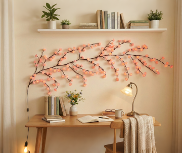 使用上传图片中的玫瑰花灯串生成一间氛围感满满的室内空间(看起来是客厅或休息区),整体风格温馨柔和: 装饰亮点:墙面用缠绕着暖黄色玫瑰花灯串的树枝造型装饰,灯光暖调柔和,营造出浪漫松弛的氛围; 软装搭配:窗户搭配了双层窗帘(内层百叶 + 外层带流苏装饰的褶皱帘),色调偏暖棕 / 米色,和浅色沙发、抱枕的风格统一; 细节:沙发上有毛绒玩偶、购物袋等物品,显得生活气息很足,右侧还能看到电视和柜子,是舒适的居家布置。 尺寸1:1