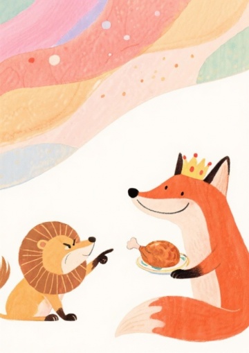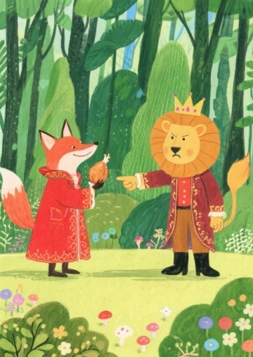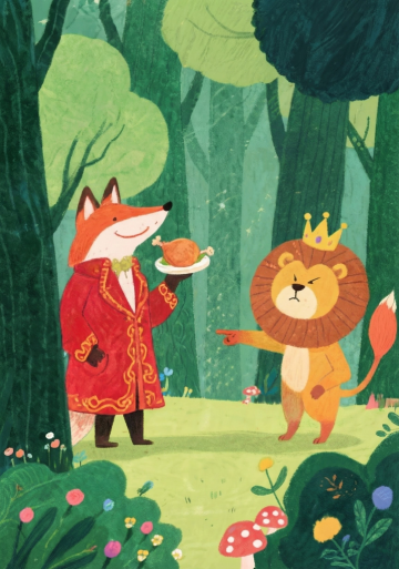 根据《列那狐的故事》中第20章内容做一张海报,竖版海报A3大小,以绿色森林为背景,近处有灌木和小花蘑菇,远处的高大的树木,画面左边三分之一处是一只狡猾的狐狸,身上披着一件红色的华丽的大衣,右边三分之一处是一只狮子,狮子的身份师王爷,穿着一条有皇室风格的裤子和一双黑色靴子 狐狸的右手拿着一只烤鸡,露出狡黠的微笑,狮子戴着皇冠,表情很生气,伸出右爪指着狐狸,狐狸和狮子中间需要留大概8CM的空间,狮子要比狐狸高一点