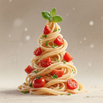 番茄意大利面条形成的圣诞树,圣诞树上是番茄和香芹碎的点缀,最顶上是罗勒叶组成的三角形