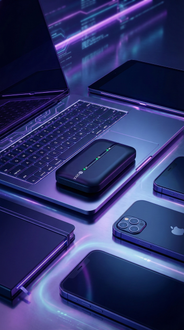 赛博朋克风格的智能手机充电场景,霓虹蓝与紫色渐变光效笼罩,手机屏幕显示动态赛博数据流图案,充电器和数据线呈现金属质感与霓虹灯带装饰,白色桌面转化为带有电路纹理的黑色高科技平台,背景墙变为布满全息投影广告和管线的未来都市夜景,整体光影对比强烈,充满未来科技感与机械美学,高细节,8K渲染,电影级构图