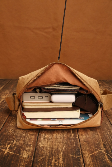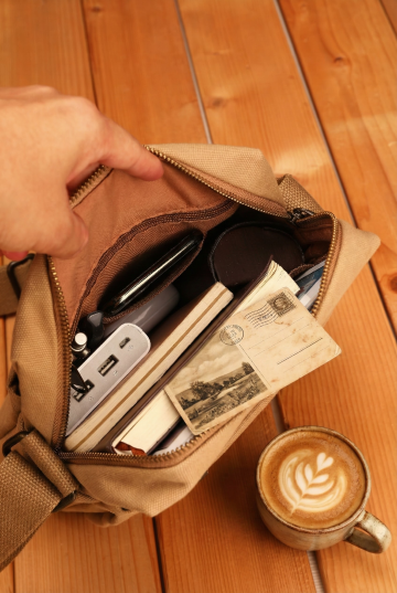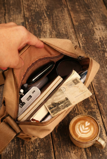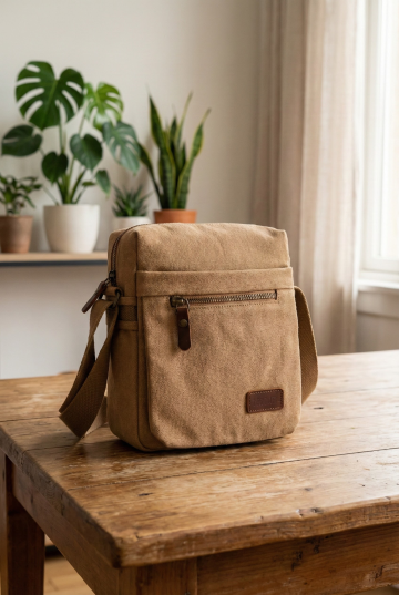 简约背包置于木质桌旁,阳光洒落,营造清新舒适氛围。