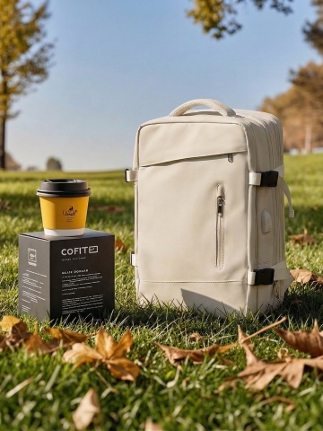 简约主义风格,柔和色调背包置于温暖阳光下,营造舒适感与宁静氛围。