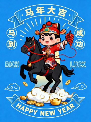 国潮插画风,拟人卡通男孩骑黑马持鞭炮,剪纸元素点缀,喜庆蓝底配金云金锭,寓意马年大吉、马到成功,节日氛围浓厚。