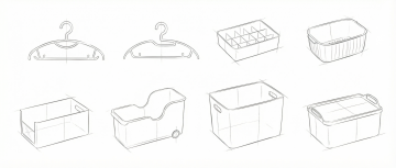 手绘风格简笔画,六支不同配色、不同样式、不同材质的笔整齐排列在白色背景上,线条简洁流畅,带有速写感的笔触,每支笔旁配有自然的线条笔触效果,整体风格统一为黑白手绘插画,画面干净整洁,视觉层次清晰,展现出文具的多样形态与艺术感。