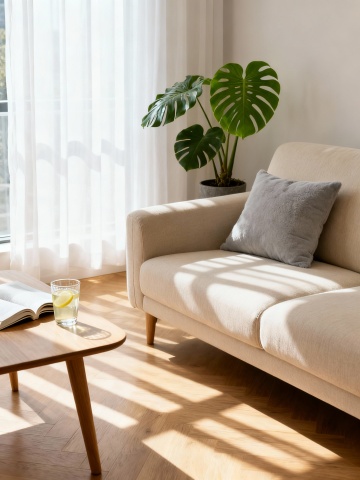 极简主义风格室内场景,以纯白色为主色调,搭配浅木色地板和家具,营造出明亮通透、宁静舒适的氛围。大尺寸白色L形布艺沙发,搭配多个白色和浅蓝色靠垫,沙发上随意搭着浅色针织毯。沙发前是一张浅色木质茶几,上面摆放着简约的白色陶瓷花瓶和蜡烛。房间一侧有一个木质置物架,上面陈列着白色陶瓷器皿和装饰画。落地窗边有大型绿色植物,白色纱帘轻柔垂落,让充足的自然光洒满整个空间。天花板上悬挂着白色球形吊灯,柔和的光影在墙面和地面形成自然的明暗过渡。整体构图采用开放式布局,线条简洁流畅,空间感十足,细节处体现出北欧简约设计的精髓。