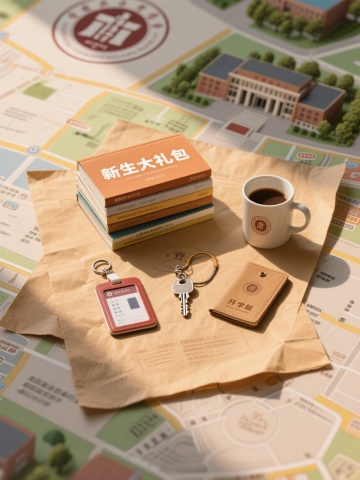 清新插画风校园地图,简约轻拟物设计,新生礼包与咖啡营造舒适开学氛围。