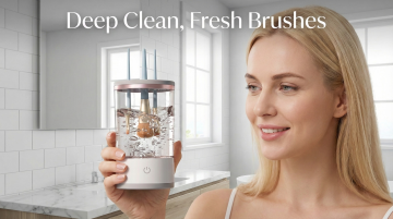 帮我生成一张欧美年轻女性站在洗漱台面前拿着这个冲牙器冲牙的图片