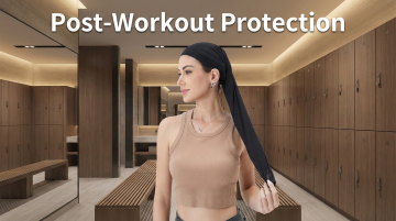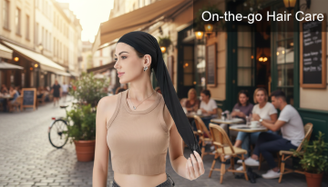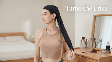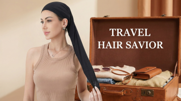 以图中的长筒帽为元素,欧美女模特用长筒帽把头发包起来,,防止头发毛躁和打结,物体主体特征不变,设计6张跟长筒帽有关的图,可以适当加一些英语文案点缀一下,比例 「16:9」