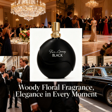 优雅奢华的香水瓶置于木雕风底座,搭配柔和插画风花卉,简约主义设计,尽显高贵。
