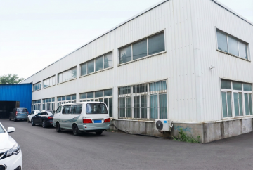 现代化工业场景,蓝色为主色调,清新明亮的光线,干净整洁的生产线,透明玻璃幕墙外是蓝天白云,绿色植物点缀在车间角落,机械臂精准运作,地面反光如镜,整体氛围充满科技感与希望