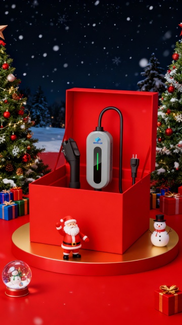 画面中心展示图中商品的红色圣诞风礼盒,摆放在红金圆形展台上,展台上元素丰富,搭配圣诞老人摆件,周围点缀圣诞元素(圣诞树、多色礼物盒、雪人水晶球),背景为夜晚飘雪的场景,以红色为主色调,营造温馨促销氛围。