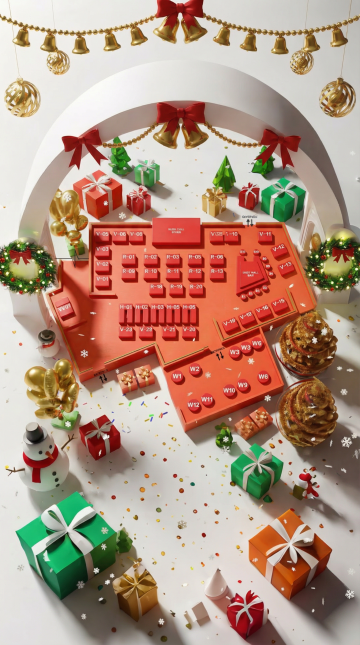 复古科技圣诞树,绿丝带缠绕金属镜头与怀表,3D重拟物拼贴风,极繁主义装饰,喜庆红背景,金属塑料质感交织,节日氛围浓烈。