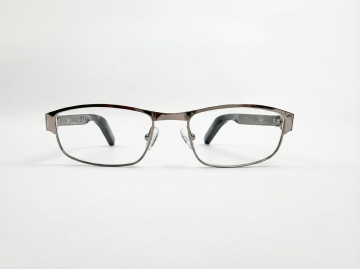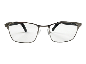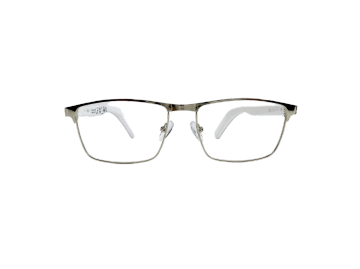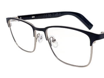 简约现代风格,纯白色纯背景,单一元素规整排布,一副黑色上框与银色金属下框拼接的方形双梁眼镜,镜片透明,金属铰链细节清晰,黑色镜脚,无文字,无logo,无水印,高清晰度,产品展示角度,光线均匀柔和,阴影浅淡自然。