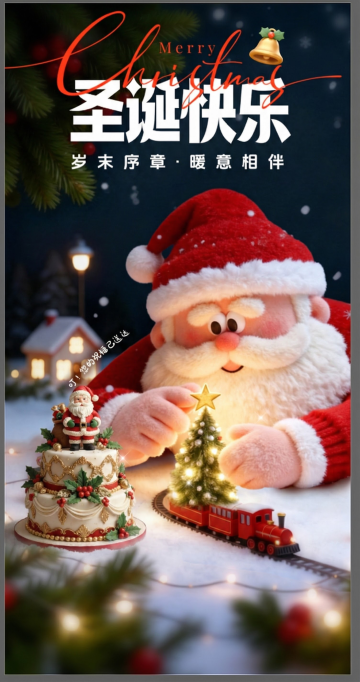 红绿水晶材质对话框堆积而成的圣诞树攀岩,对话框里是祝福语(欢喜为字,钟声为信,雪花为笺,星光为序,新岁为章,初心为舵,美好为向,平安为谱,希望为芯,暖阳为衣,灯火为途,好运为礼,麋鹿为使,愿您如跨年烟火,绚烂前行),圣诞树顶部是黄色发光的五角星,底下是堆积丰富的礼盒。下层有圣诞老人玩偶、毛绒驯鹿(挂绿围巾)、堆叠的礼盒、一堆人在摊位面前唱歌 、跳舞、庆祝。放置在圣诞市集的木质摊位中央,摊位周围摆满彩色圣诞礼品、热红酒杯、姜饼人饼干与手工花环,悬挂彩色气球与暖黄串灯。背景为热闹的市集、其他装饰精美的圣诞摊位与大型圣诞树,空中串着一些暖黄串灯,有灯光秀,天空飘着细碎雪花。色彩鲜艳,暖光光线(摊位灯光璀璨),玩偶摆出挥手、递礼物的动态,整个场景具有热闹喜庆的动态感。