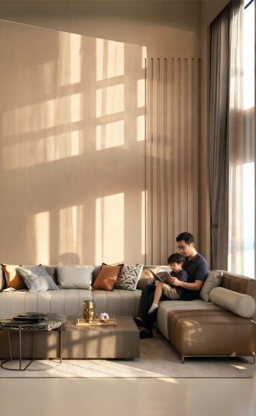极简主义风格的室内背景,柔和的米白色墙面搭配浅木色人字拼地板,自然光透过米白色半透明窗帘洒入,营造出明亮通透、宁静舒适的氛围。房间中央摆放着一组不同设计的浅灰色布艺沙发,搭配深绿色和浅蓝色的几何图案靠垫,沙发前是一张椭圆形的黑色大理石茶几,上面放置着一个造型简约的玻璃花瓶,插着几支干枯的芦苇。墙上悬挂着一幅抽象风格的装饰画,画面以深蓝色和金色为主色调,呈现出流动的线条感。房间另一侧的墙角摆放着一盆高大的琴叶榕,种植在一个哑光白色的陶瓷花盆中。天花板上安装着一盏造型独特的黑色金属吊灯,灯光温暖柔和。整个空间的配色以低饱和度的灰色、蓝色和绿色为主,搭配原木色的自然质感,展现出简约而不失高级感的现代设计美学。