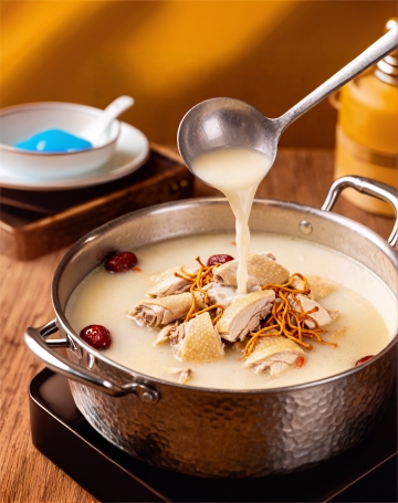 中式暖锅,金属质感锅具盛装热气腾腾的羊骨汤,搭配油润汤汁与液态光影,辅以葱花、辣椒、蒜瓣点缀,实景感十足,传递质朴温馨的冬日食光。