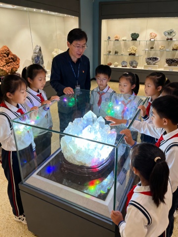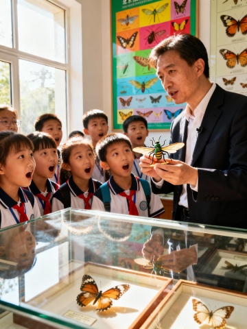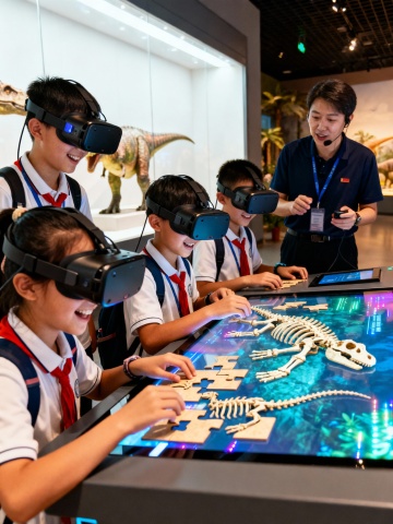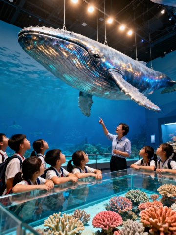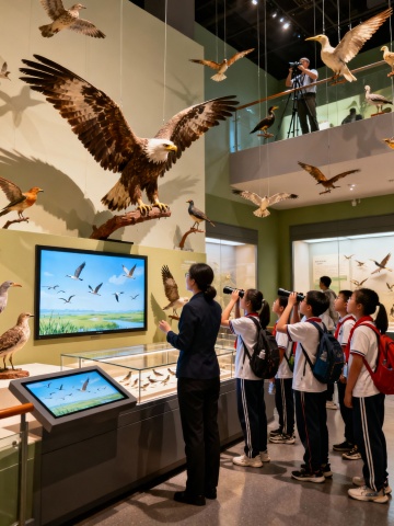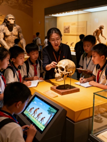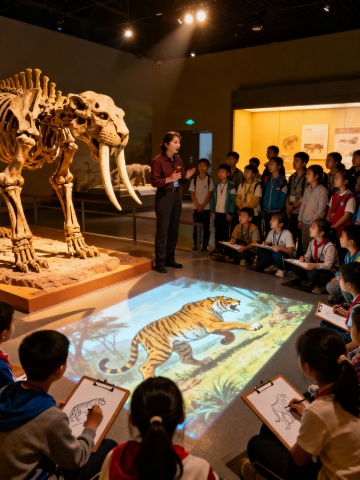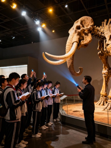 生成北京自然博物馆学生听讲解的画面,10张