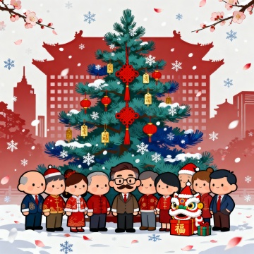 图片背景色为中国红,背景为现代办公楼与中式飞檐结合的剪影,圣诞树以青松造型呈现,悬挂红色中国结、小灯笼与金色平安符作为装饰。四周飘落雪花与梅花。 树前是公司团队身着节日服饰开心的卡通合影,团队中间是位男士,戴眼镜,八字胡。角落两边放置戴着圣诞帽的醒狮头,手持“福”字。和带圣诞帽的熊猫抱着礼物盒。 主标题“共赴新程,圣诞同欣”副标题“同心创佳绩,和美共佳节” 主色调:故宫红、暖金、月白 点缀色:松绿、靛蓝(凸显中国风清雅与节日浓郁对比)