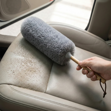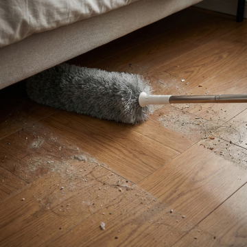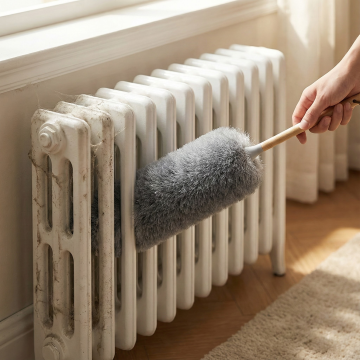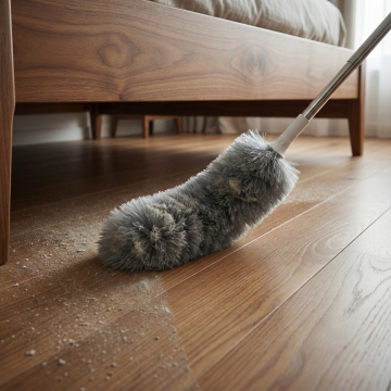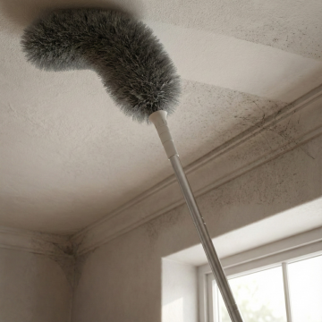图中是静电除尘鸡毛掸子,用图中产品生成场景,场景为:精装修室内房顶打扫,打扫过的位置和没有打扫过的位置有轻微灰尘和干净的对比,保持产品一致,比例为1:1,生成四张