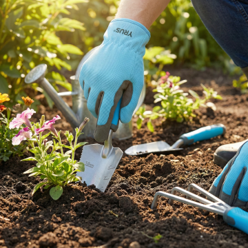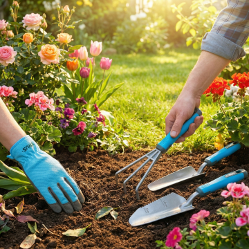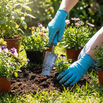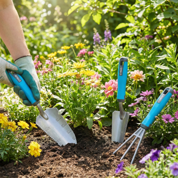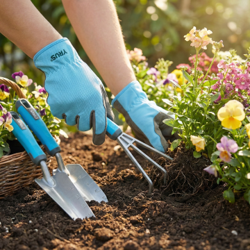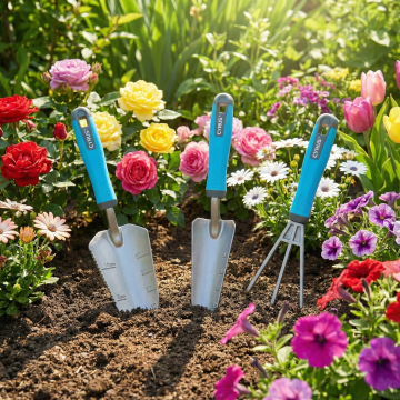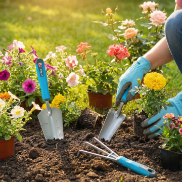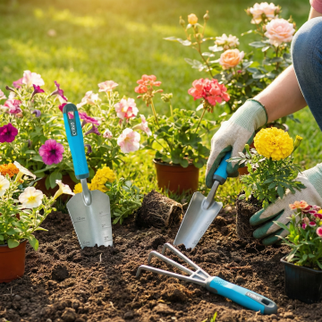 比例1:1产品场景图,阳光明媚的花园里,产品与盆栽鲜花放在花园一角摆放,不需要出现人物容貌