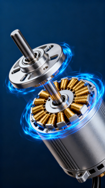 高端3D渲染的电机内部结构爆炸图,金属质感的银色齿轮与铜色线圈精密咬合,蓝色和橙色的能量光环环绕旋转,产生动态电流效果,黑色背景中散落着红色和橙色的粒子火花,营造出科技感与未来感,光线从右上角斜射而下形成渐变光影,突出机械部件的细节和立体感,不同样式的电机组件悬浮展示,齿轮、轴承、线圈等核心元素清晰可见,整体构图呈现出强烈的视觉冲击力和科技氛围。