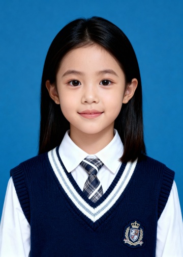 女生证件照,黑色学士袍,内衬是天青色汉服,鬓角和帽子上簪青色洋桔梗和青色玫瑰、白色小花,学士帽穗子,手执卷轴,领口复古花纹,黑灰色朦胧背景。