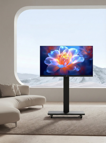 一台现代超薄液晶电视,屏幕上显示着高清写实风格的雪山风景,画面中巍峨的雪山峰顶覆盖着洁白的积雪,山体呈现出灰黑色的岩石纹理,山脚下是金黄色的植被和蜿蜒的河流,河流中点缀着大小不一的黑色岩石,天空是清澈的淡蓝色,整体色彩鲜明,光影层次丰富,电视的银色金属支架支撑着屏幕,展现出简约而现代的设计感。