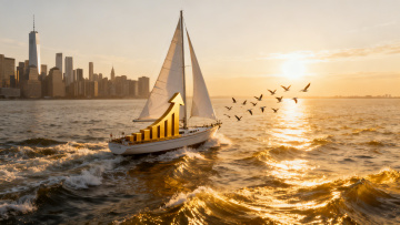 一幅展现帆船在广阔海面上航行的摄影作品,整体呈现温暖的日落色调,天空从顶部的明亮橙黄色逐渐过渡到底部的柔和橘红色,巨大的金色太阳位于画面上方中央,光芒万丈,在平静如镜的海面上投射出一条长长的、闪烁着金色光芒的倒影,延伸至画面下方中央。一艘白色的单桅帆船正航行在这片金色的海面上,帆船体积较小,位于画面中下部,船帆饱满,清晰可见,船身及船帆在水面上形成清晰的倒影。海面呈现出从近景的深蓝色向中远景的金黄色渐变的色彩层次,水面波光粼粼,细节丰富,展现出写实的海水质感和光影效果。画面采用极简的构图,大面积的天空和海面形成开阔的留白,营造出宁静、悠远、壮丽而又充满希望的氛围,没有任何文字、LOGO、二维码或多余元素干扰主体视觉。