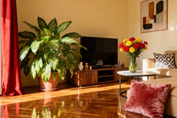 3D渲染的室内绿植,白色背景,一株茂盛的琴叶榕,深绿色的提琴形状大叶片自然舒展,茎干直立,栽种在表面带有细微纹理的白色陶瓷花盆中,花盆底部放置一个浅色圆形木质托盘,整体光影柔和,叶片边缘有自然高光,阴影清晰投射在背景上,植物形态饱满,细节精致,具有真实的材质感和立体感。
