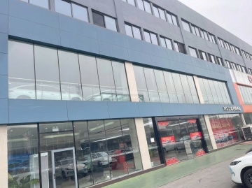 现代主义风格工厂建筑,简洁的白色几何体块外观,大面积玻璃幕墙入口,整齐排列的条形窗户,开阔的混凝土广场,道路旁点缀着几棵高大的绿树,晴朗的蓝色天空中飘着少量白云,光线明亮柔和,阴影清晰,整体呈现出干净、专业、高效的工业氛围。