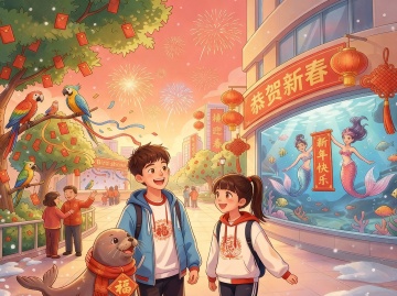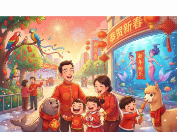 国潮插画风,拟人童趣与鎏金马匹相映,剪纸元素点缀,红金配色尽显中式喜庆,烟花灯笼烘托新春氛围。