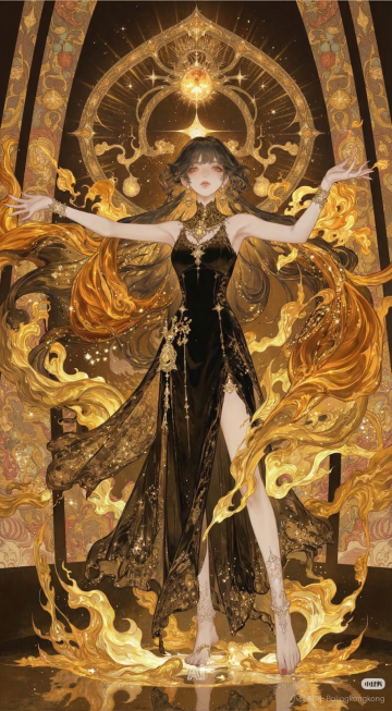 中国风二次元动漫风格,一位身着红色与金色渐变飘逸古风长裙的少女,长发如墨色瀑布般垂落,发间点缀着金色凤凰发饰,右手掌心托着一朵燃烧的金色莲花,莲花周围环绕着红色火焰光晕,左手自然舒展,裙摆与长发随风飘动,姿态轻盈灵动,面部表情温柔恬静,眼神清澈,整体线条流畅细腻,色彩鲜明且具有层次感,光影柔和,背景为纯白色,无其他元素干扰。