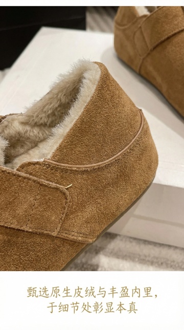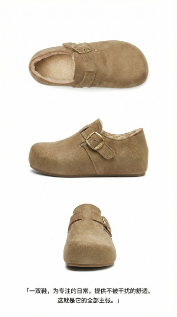 视觉:左文右图,纯色(浅米白)背景。 左侧(文字区): 标题:所见所触,皆非偶然 列表式阐述: 牛皮反绒:A级牛背革,保留原生绒面与呼吸毛孔。触感温润,色泽均匀。 羊羔绒内里:9mm新西兰羔羊毛,蓬松结构。提供物理恒温,而非化学暖感。 软木乳胶鞋床:天然软木颗粒与乳胶混合,预备贴合每一步。 右侧(图像区):三张高精度特写拼贴:①绒面皮革的微观纹理;②蓬松羊羔绒的截面;③鞋底材质的细腻颗粒。