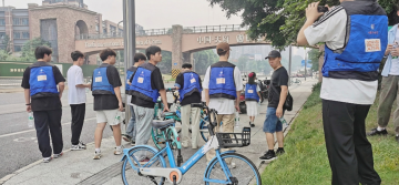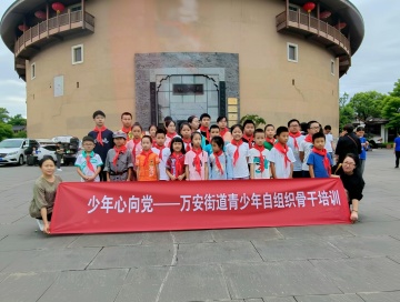 请在屋檐下加一条红色横幅,内容为“盲道治理,共筑友善”——盲道治理小队活动