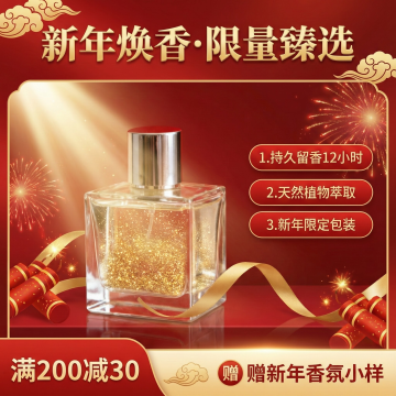 国潮风年货盛典海报,鎏金文字与祥云烟花点缀,重拟物香水瓶凸显金属质感,红金配色传递喜庆中式氛围,促销信息醒目,节日氛围浓厚。