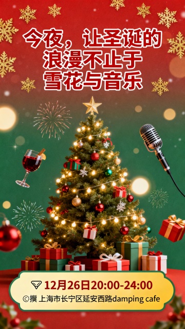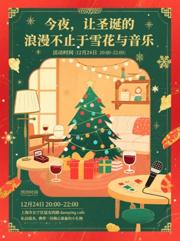文字信息:主标题:“圣诞奇妙夜”,副标题“解锁圣诞 放肆嗨玩”; 时间:2025年12月24日 18:30–21:30;地点:稿定活动中心大厅;内容:圣诞音乐派对|礼物交换|热红酒|圣诞惊喜互动