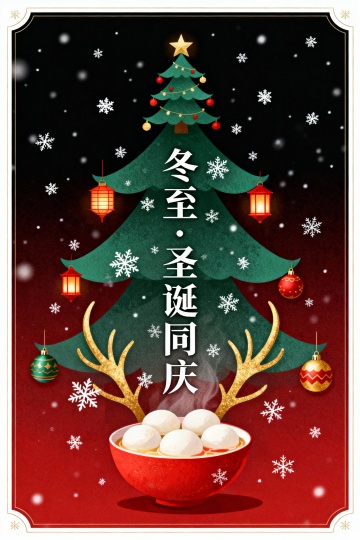 冬至夜雪落庭院,水墨笔触勾勒“冬至”大字,红灯笼映暖光,家人围坐包饺子,剪纸窗花透温情,国潮风韵中尽显中式复古与喜庆温馨。