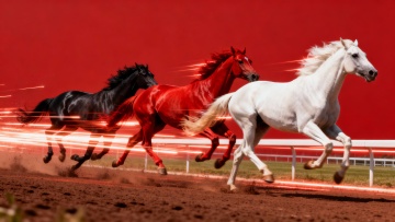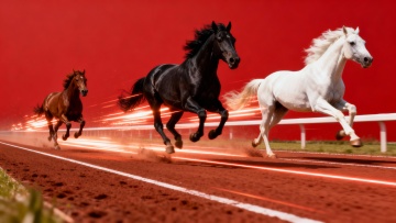 生成一副图片,红色背景(色值RGB 255 0 0),三匹马从左向后在赛道上狂奔,白色马在最右侧,中间为红色马,最后为黑色马,三匹马奔跑着带着速度光效,效果逼真,张力大,奔跑速度感十足。4K影视级视觉效果,整体配置光影和谐。