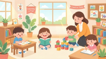 2位年轻女教师一起在画面中心,与一群4岁孩子们热情互动,一位老师蹲在地上被一个4岁小女孩紧紧抱住,一位老师站立拿着孩子的画,一位老师拿着鲜花,一个小男孩送上一个红苹果,一群孩子们穿浅蓝色校服举起蜡笔画围绕在画面周围,背景为现代化多媒体教室,有大电视显示教师节快乐字体,木板地面,幼儿园教室,五彩纸屑,花瓣在空中飘浮,暖黄色温馨光影,阳光从窗户斜射进来,电影感镜头,正视角度,画面重心偏下,超写实风格,