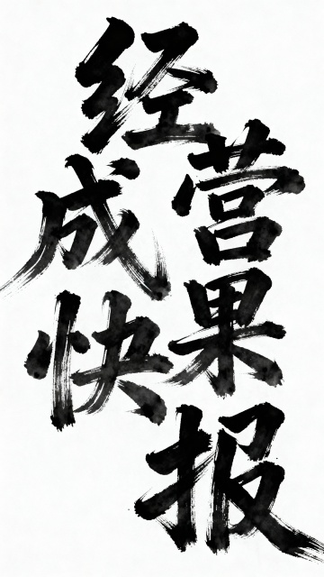 生成一组毛笔字,内容为“经营成果快报”,要求为: 笔触奔放洒脱:笔画粗细对比强烈,既有厚重的墨块,也有纤细的飞白(笔画中露出的纸色纹理),张力十足。 笔势连贯灵动:字间、笔画间有自然连带,兼具行书的流畅与草书的豪放,能感受到书写时的动态韵律。 墨韵质感浓厚:保留了毛笔书写的枯笔、晕染效果,是手写书法的随性质感,而非印刷体的规整感。 整体气势开阔:字形舒展不拘谨,风格契合昂扬意境,视觉冲击力强。